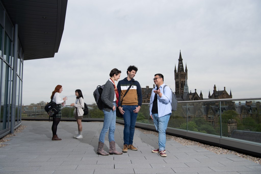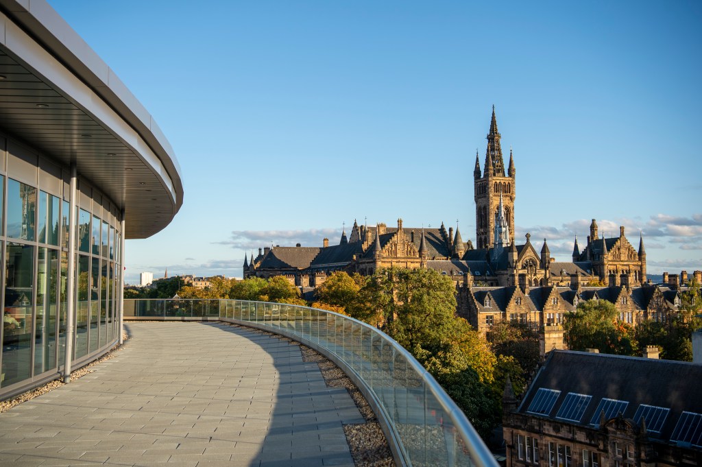 The Gilbert Scott Building seen from the James McCune Smith Learning HubStudents on the viewing deck of the James McCune Smith Learning Hub (UofG Photo Library)